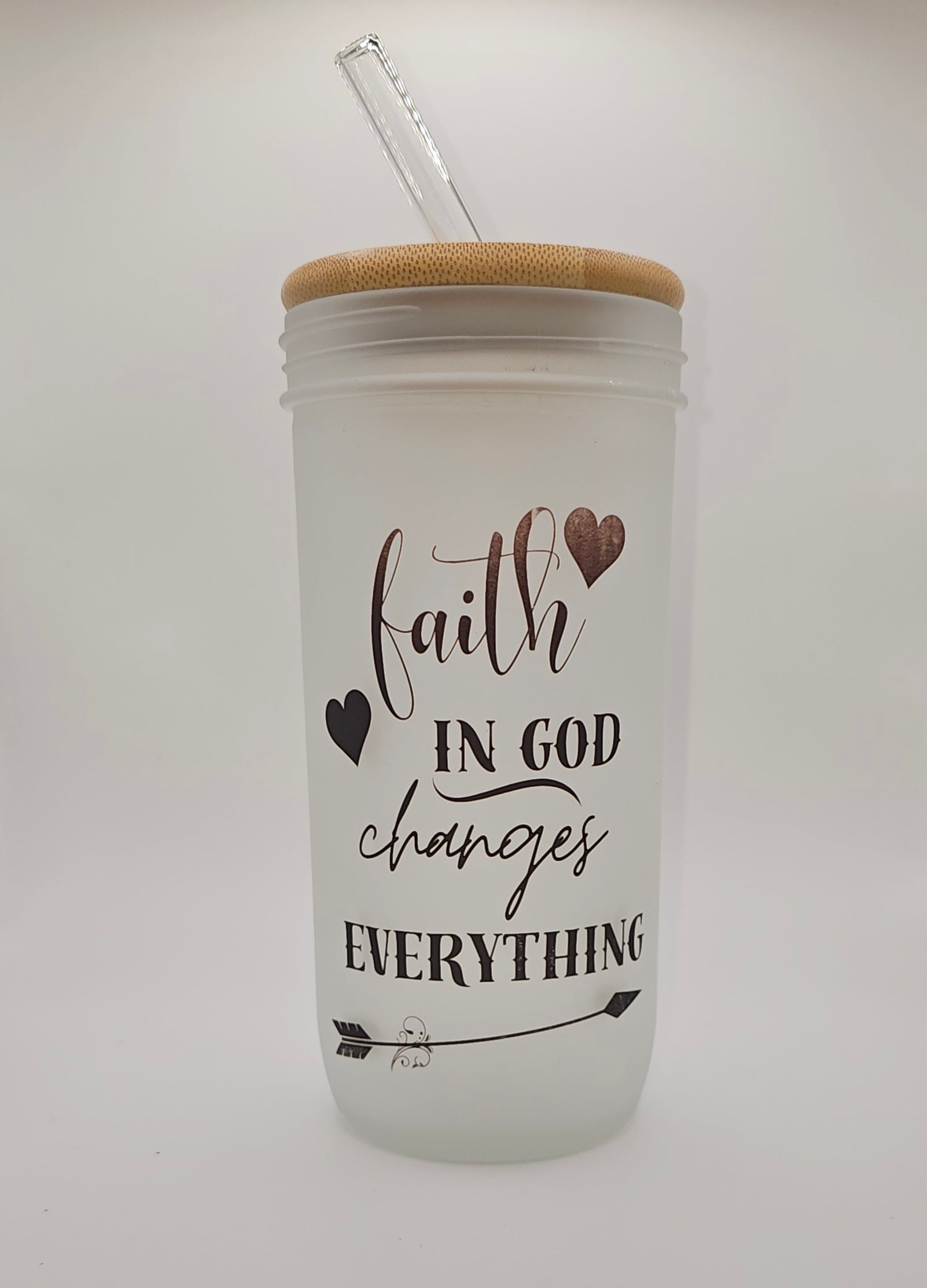 A daily dose of truth in your hand. This frosted glass tumbler features a powerful message:“Faith in God changes everything.”