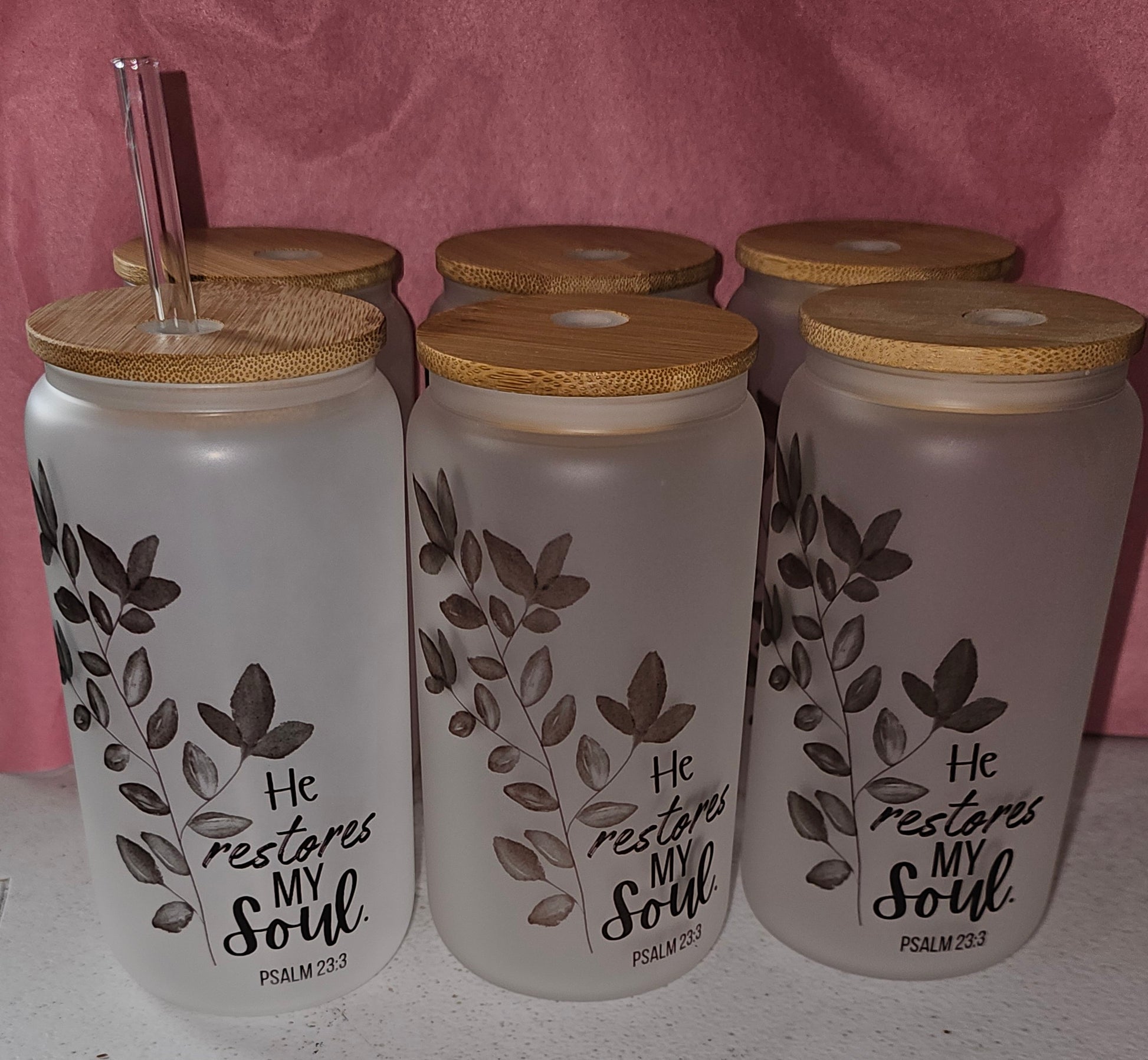 “He Restores My Soul” Frosted Glass Tumbler – 16oz